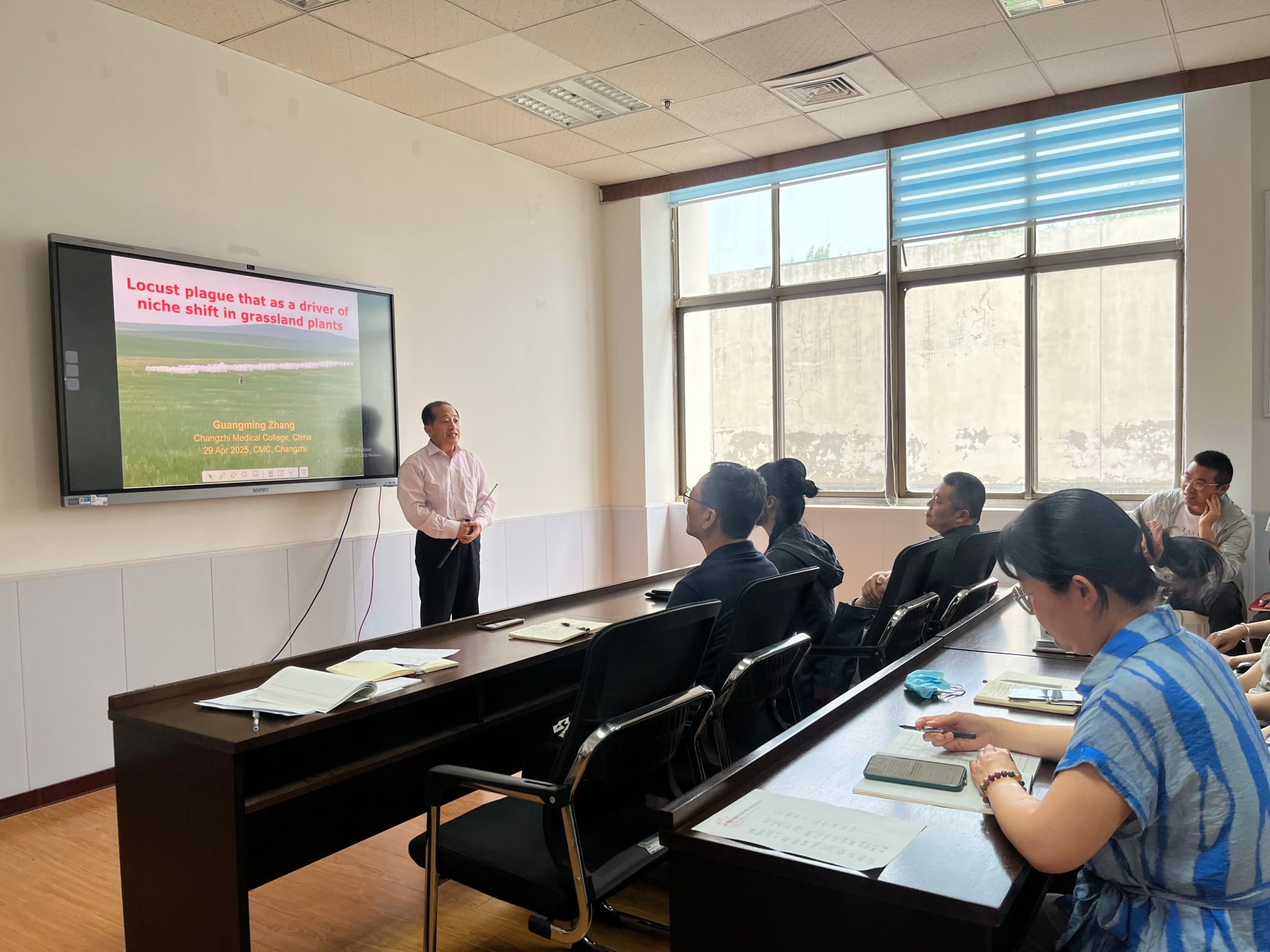 在本期学术报告环节,英国上市公司365中药资源与鉴定教研室的张光明博士带来了题为《蝗灾对草原植物 C:N:P 化学计量生态位的影响》的精彩分享。张光明博士聚焦内蒙古锡林郭勒草原生态系统,详细汇报了不同程度蝗灾对常见植物C:N:P 化学计量生态位宽度和重叠的影响研究成果,并深入探讨了这些研究对于草原植物资源合理利用的重要意义。报告引发了在场教师的热烈讨论与深入思考。