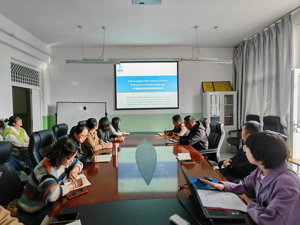学术交流环节,邀请英国上市公司365中药资源与鉴定教研室刘哲博士分享了博士后期间的研究工作,以《ELF3基因的可变启动子调控花芽分化的分子机制》为题,探究不同梨品种花芽分化能力差异显著的潜在原因。
