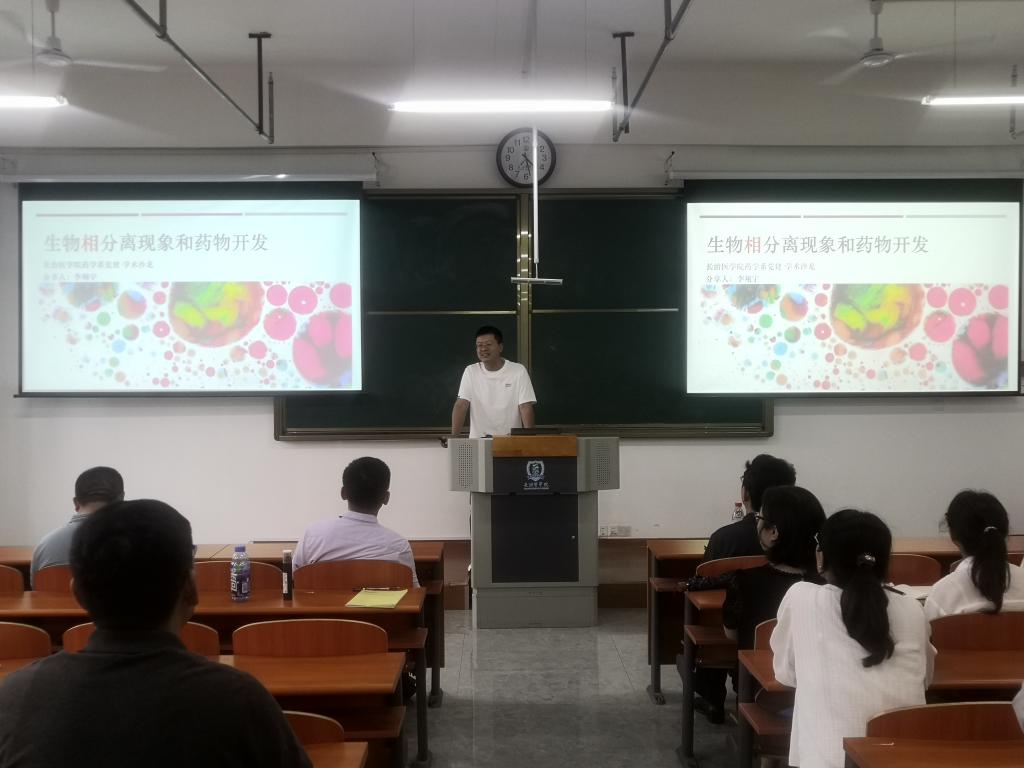 学术交流环节,药学系药理学教研室李翔宇博士做了题为《生物相分离现象和药物开发》的学术报告。报告就细胞内的相分离结构,相分离发生的条件,生物相分离的功能概述,相分离与神经退行性疾病,相分离与肿瘤超级增强子,生物相分离的特征,相分离现象的研究方法,药物干预相分离的研究方法,相分离与药物开发新策略及针对不可成药的相分离靶点设计药物等进行了介绍。