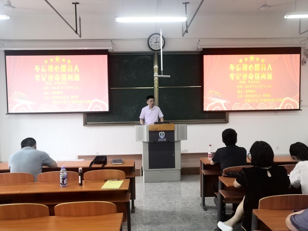 7月3日下午,药学系第二十六期“不忘初心抓育人 牢记使命强内涵”党建·学术沙龙在润智楼401教室举办。药学系党总支全体教工党员、博士和部分教师共40余人参加活动,沙龙由药学系主任贺艳斌主持。