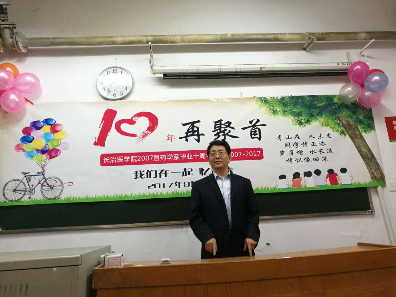 8月26日上午,药学系2007届毕业生相聚母校合影留念,公司副经理宋晓亮、原药学系副主任郑王巧以及部分教师参加了此次聚会。合影之后,大家来到了44教,在这里他们度过了生命中最重要最美好的四年时光。在教室里,学子们再一次坐在了自己曾经熟悉无比的座位上,聆听了宋晓亮副经理的讲话。宋晓亮副经理向大家介绍了药学系开拓、发展、壮大的历程以及目前在教学、科研方面取得的一系列成绩,表达了对学子们相聚母校的热烈欢迎,真诚地希望同学们以自己毕业十年的经历对药学系的培养方案、课程设置等方面提出意见和建议,最后亲切地祝福大家在今后的人生旅途中家庭幸福!事业辉煌!讲话结束后,2007届毕业生代表刘旺向系里赠送药典一套。