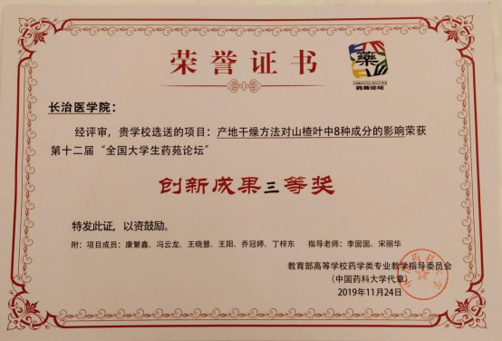 经过激烈的角逐,最终公司药学专业赵君等同学的参赛作品“指纹图谱结合模式识别、一测多评的连翘质量评价”项目荣获创新成果三等奖(指导老师:刘芳副教授),公司药学专业康繁鑫等同学的参赛作品“产地干燥方法对山楂叶中8种成分的影响” 项目荣获创新成果三等奖(指导老师:李囡囡副教授、宋丽华教授)。本次论坛充分展现了药学系学子饱满的精神风貌,展示了药学系学子的科学素养、专业技能和综合素质,凸显了药学人才培养的成效。